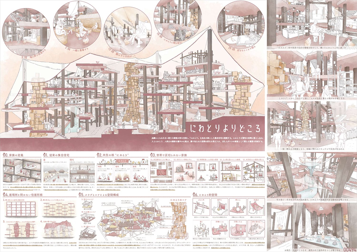 かつての集落では、水や食、祈りなどを共生の核に人が集まり関係を築いてきたという前提のもと、本提案では「にわとり」を共生の核として位置付けた。時間で鳴き、群れで行動し、人と馴れ合うことを好むにわとりの習性を空間に落とし込むことで、1人、夫婦、友人同士など、世帯の枠にとらわれない100人が、一つの家族として暮らす集落を想定したという。