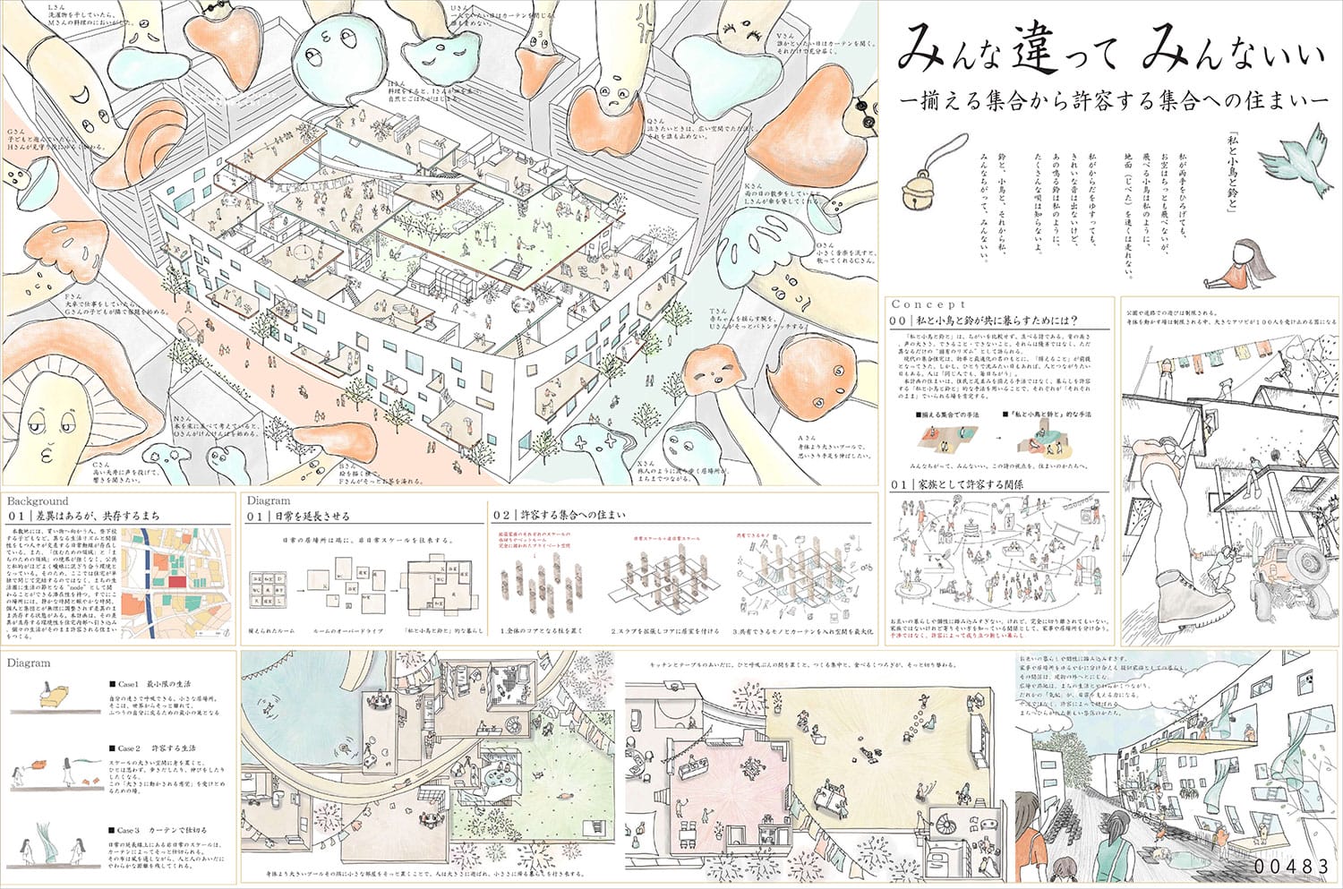 また、スラブがオープンになっている理由について、「従来の住居形態では壁が世帯を分けてしまっているため、あえて壁を取り払い、透明や半透明の膜を用いました」と回答。「にわとりを抜いても成立するアプローチがあれば、なおよかった」という審査員からのコメントもあった。
