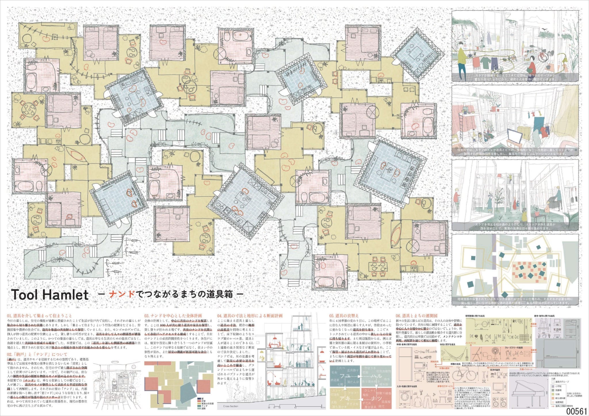 全体構造として、中心に各住戸への玄関ともなる共有のナンドを配置。ここには100人がともに使う道具や家具がしまわれ、貸し借りが行われる。さらに季節の変わり目には使わなくなった道具を持ち寄り、ストックされた中から新しいものを持ち帰る。保管される道具が入れ替わることで、街の風景も季節を通じて移り変わるという。