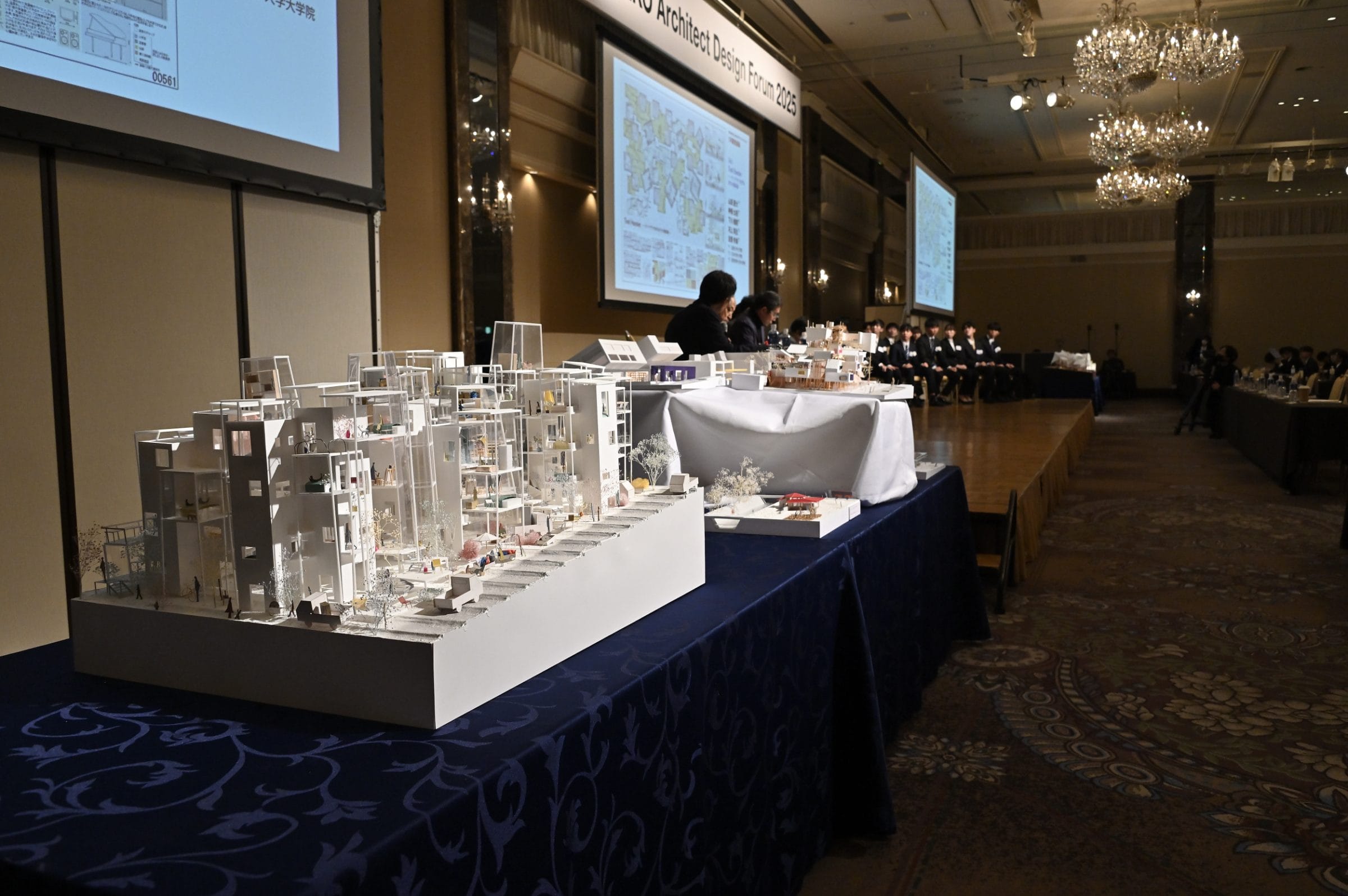 2次審査会の会場となったシェラトン都ホテル「醍醐」のエントランスには、上位4点、佳作10点のプレゼンシートが設置され、それぞれの作品を通して伝えたいことや工夫した点がわかりやすくまとめられていた。会場内には、上位4点の模型も並んでいた。