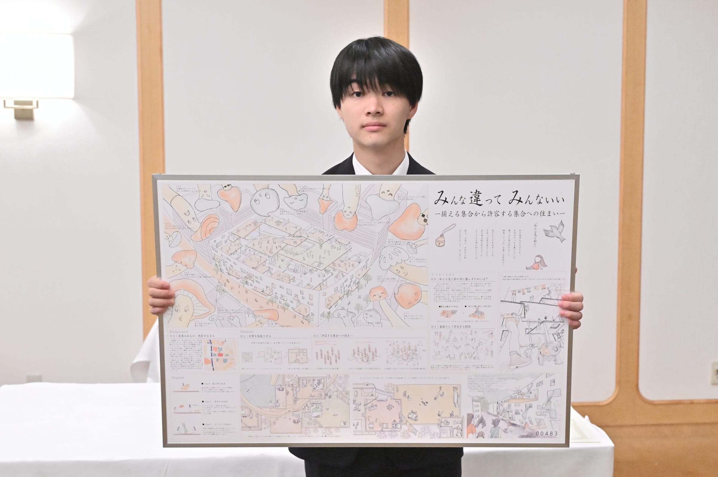 2年前にも同コンペに応募し、佳作を受賞したという来間さん。「今回のテーマは、集落と家族、どっちに振り切るか悩みました。結果は満場一致でしたが、議論や講評を聞く中で反省点や学びもたくさんあったので、今後の糧にしていきたいです」とも話してくれた。